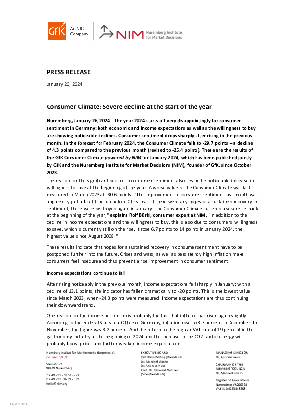 Nuremberg, January 26, 2024 - The year 2024 starts off very disappointingly for consumer sentiment in Germany: both economic and income expectations as well as the willingness to buy are showing noticeable declines. Consumer sentiment drops sharply after rising in the previous month. In the forecast for February 2024, the Consumer Climate falls to -29.7 points – a decline of 4.3 points compared to the previous month (revised to -25.4 points). These are the results of the GfK Consumer Climate powered by NIM for January 2024, which has been published jointly by GfK and the Nuremberg Institute for Market Decisions (NIM), founder of GfK, since October 2023.