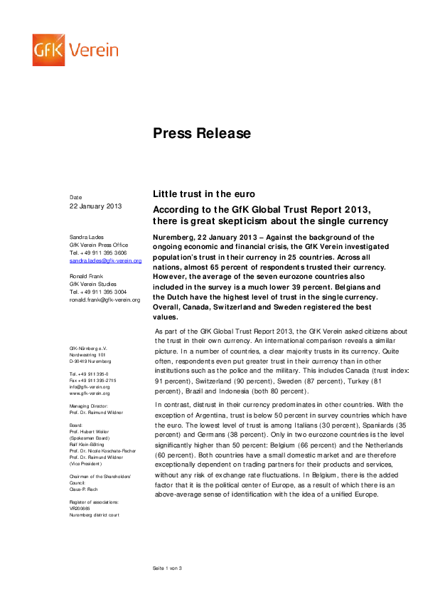 Little trust in the euro – According to the GfK Global Trust Report 2013, there is great skepticism about the single currency
