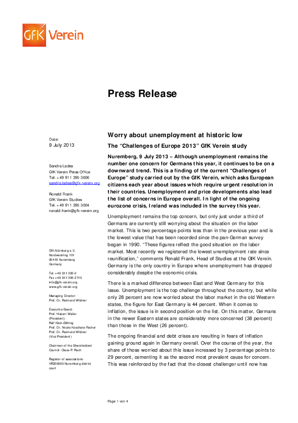 Worry about unemployment at historic low The “Challenges of Europe 2013” GfK Verein study