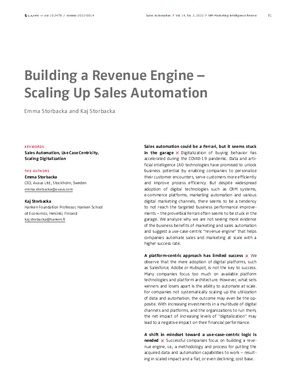 The scalability of sales automation is dependent on a company’s capacity to create and operate use cases. For businesses not systematically scaling up data utilization and automation, increasing levels of “digitalization” may negatively impact financial performance. Successful companies focus on building a revenue engine to achieve a scaled impact and a flat or even declining cost base. To scale, companies need to stop structuring their digital transformation initiatives via the platforms they are implementing and start using a use-case-centric lens. In a use-case-centric logic, business priorities and applications are the starting point. Use cases leverage the available data through automation and employ digital platforms as supporting tools to drive specified business objectives. In most companies, existent practices need to be challenged, and the methodology and process will require leadership skills. Managers need to understand the effort required to reach the target automation level, and to keep the engine running, marketing and sales need to improve their data literacy.