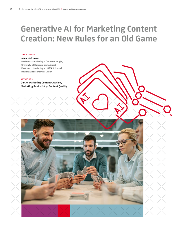 A striking image, a catchy claim, a funny video: High-quality content builds brands, excites audiences and persuades them to purchase. Finding the right content determines success in diverse activities and in various marketing functions such as advertising, public relations, social media marketing, customer relationship management, inbound marketing or personal sales. What makes generative AI (GenAI) truly revolutionary is that the same technologies promise to impact the entire value system of the content of marketing management. We have learned that GenAI can help produce high-quality content of literally any modality in terms of text, images or certain types of video. In a recent survey of 600 B2C marketers, about 50% report regular usage with plentiful applications as Fabian Buder and colleagues report in this issue (p.50). Given the versality of GenAI and the plethora of its potential applications, how should marketers make sense of the scope of change driven by GenAI?