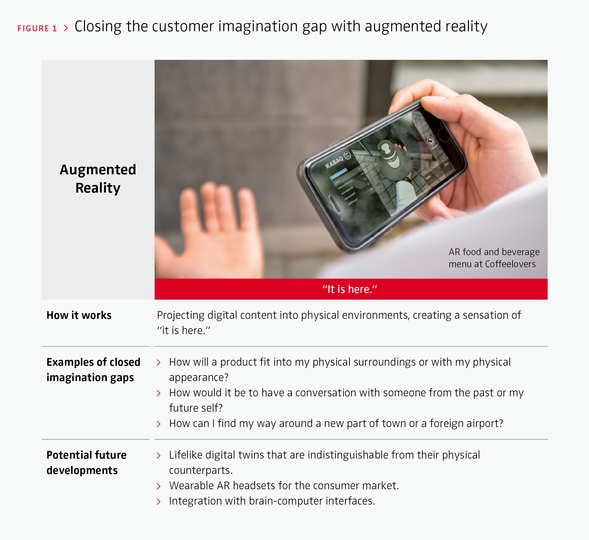 To help customers bridge these gaps, many companies have turned to extended reality, also referred to as x-reality, including augmented reality (AR) and virtual reality (VR), as well as mixed realities. AR and VR are the main representatives of this new class of technology, and they offer vast opportunities for creating value for businesses and consumers. While AR projects digital content into physical environments and creates a sense of “it is here,” VR transports users into digital environments and gives them an “I am there” sensation. Figures 1 and 2 summarize how AR and VR applications work, provide examples of closed imagination gaps and offer an outlook on future developments.