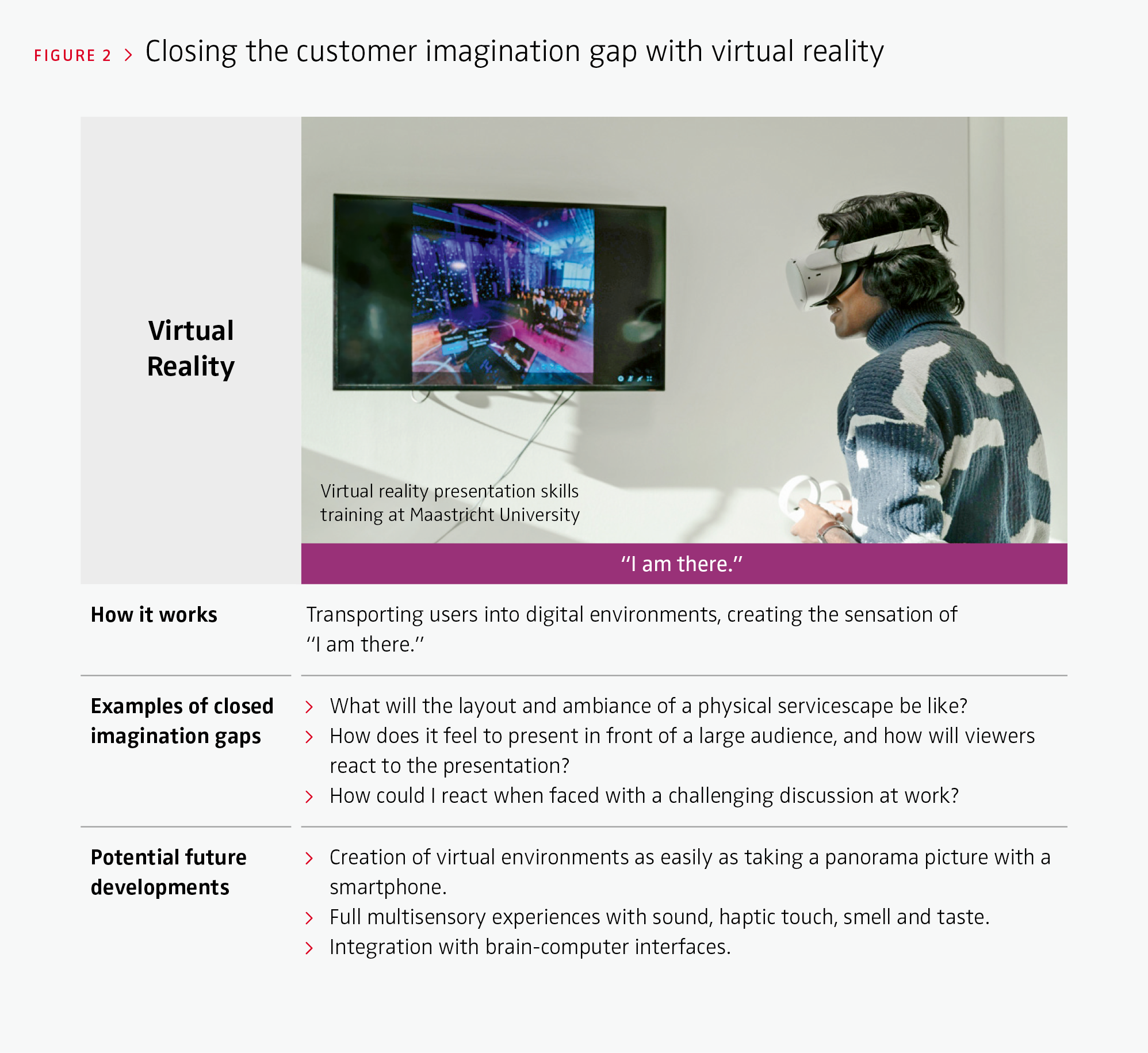 “Is this going to make me feel sick?” was initially a common concern amongst first-time VR users. Fortunately, the days in which customers needed to place their smartphone in a cardboard box to experience VR, only to be overcome by motion sickness, are over. Advanced and affordable headsets like the Oculus Quest series let customers immerse into a different space (and time), giving them a unique sense of “I am there.” In this way, VR opens opportunities for not only improving existing customer experiences but also delivering new value propositions. For example, the Dutch startup Psylaris offers VR experiences aimed at helping patients in mental healthcare to process trauma, resulting in significantly decreased subjective distress. VR is also used to enhance the learning experience in higher education, where students often find it difficult to practice crucial soft skills. At Maastricht University, for example, “practicing in the mirror” is rapidly becoming a thing of the past, as presentation skills training in VR lets students immerse themselves into a lecture hall with a seemingly real audience that reacts to what is presented and how it is presented (see Figure 2).