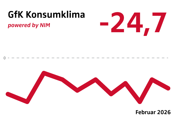 Im Februar hellt sich die Stimmung der Verbraucher nicht weiter auf: Während die Einkommenserwartungen noch leicht zunehmen, trübt sich die Anschaffungsneigung ein. Die ohnehin hohe Sparneigung steigt auf den höchsten Wert seit der Finanzkrise 2008. Der Konsumklima-Indikator sinkt daher im März um 0,5 Punkte auf −24,7 Punkte.