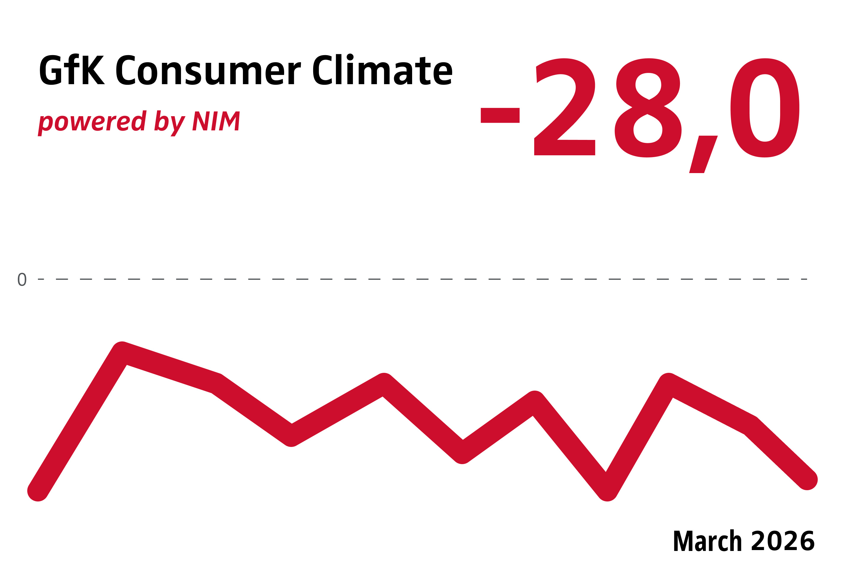 Nuremberg, 26 March 2026 – The war in Iran is dampening consumer sentiment. According to consumer expectations, the Consumer Climate indicator for April 2026 decreases to -28.0 points. This represents a decrease of 3.2 points compared with the previous month (revised to -24.8 points). Whilst no significant effects are yet visible in terms of the willingness to buy or save this month, income expectations are noticeably dampened because of inflation fears. This is shown by the latest results of the NIM Consumer Climate powered by GfK, which has been published jointly since October 2023 by the Nuremberg Institute for Market Decisions (NIM), founder of GfK, and NIQ/GfK.