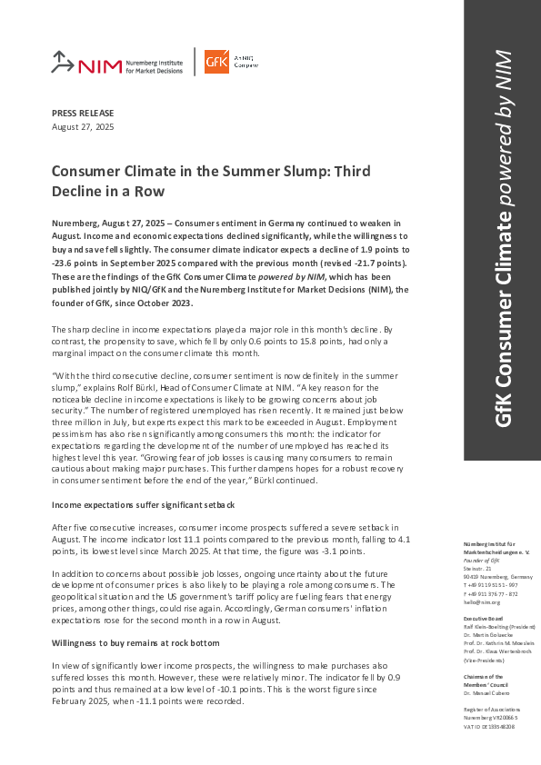Nuremberg, August 27, 2025 – Consumer sentiment in Germany continued to weaken in August. Income and economic expectations declined significantly, while the willingness to buy and save fell slightly. The consumer climate indicator expects a decline of 1.9 points to -23.6 points in September 2025 compared with the previous month (revised -21.7 points). These are the findings of the GfK Consumer Climate powered by NIM, which has been published jointly by NIQ/GfK and the Nuremberg Institute for Market Decisions (NIM), the founder of GfK, since October 2023.