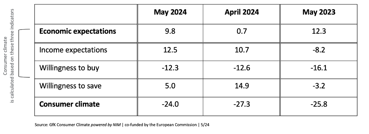 The survey period for the current analysis was May 2 to May 13, 2024. The results are extracted from the “GfK Consumer Climate powered by NIM” study and are based on around 2,000 consumer interviews per month conducted on behalf of the European Commission. The report presents the indicators in the form of graphics accompanied by brief comments. Consumer sentiment refers explicitly to all private consumer spending. Depending on the definition used, however, retail accounts for only around 30 percent of private consumer spending. Services, travel, housing costs, healthcare services, and the wellness sector as a whole account for the rest. Again, this does not apply to retail sales, but instead to total consumer spending. Like all other indicators, willingness to buy is a confidence indicator. It indicates whether consumers currently consider it advisable to make larger purchases. Even if they answer “Yes” to this question, there are two further requirements for making a purchase: The consumer must have both money required for such a large purchase and must also see a need to make this purchase. Furthermore, this only concerns durable consumer goods that also require a larger budget.