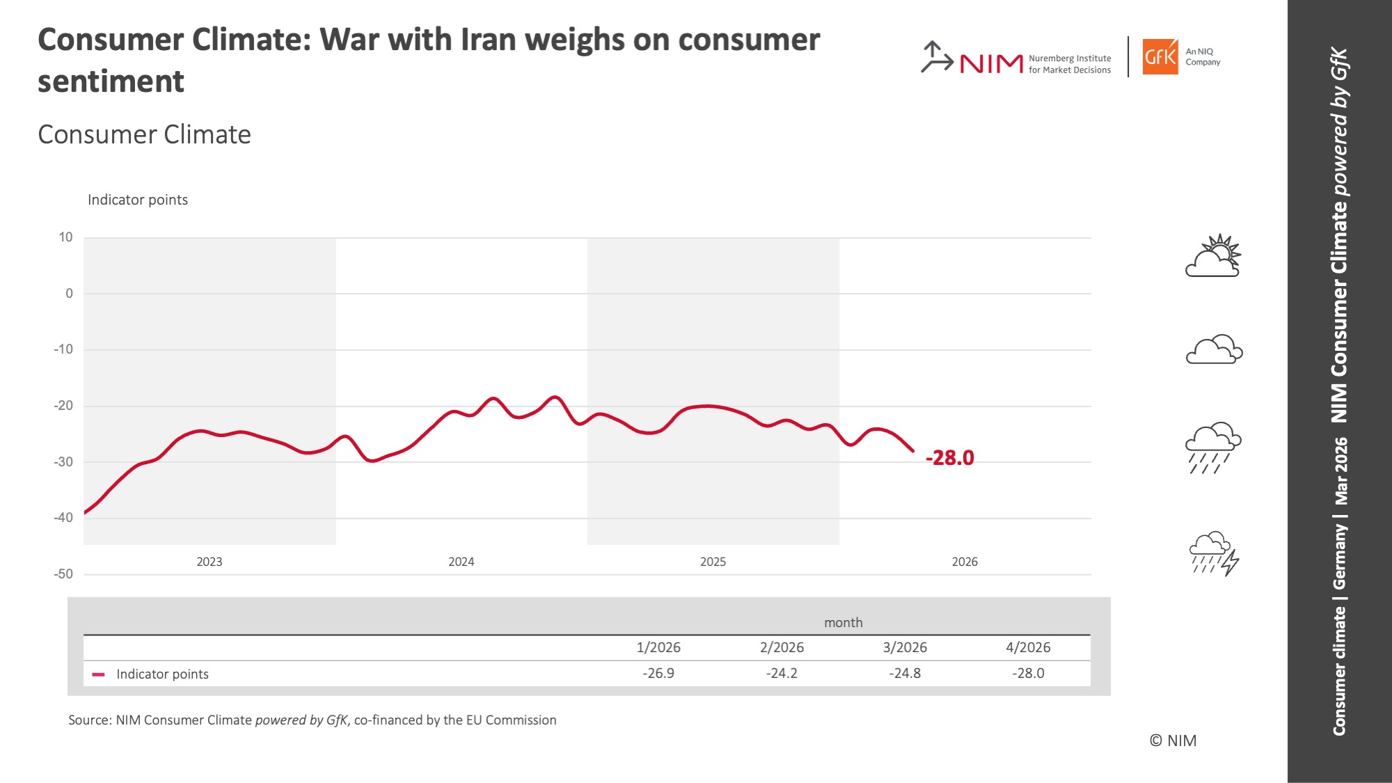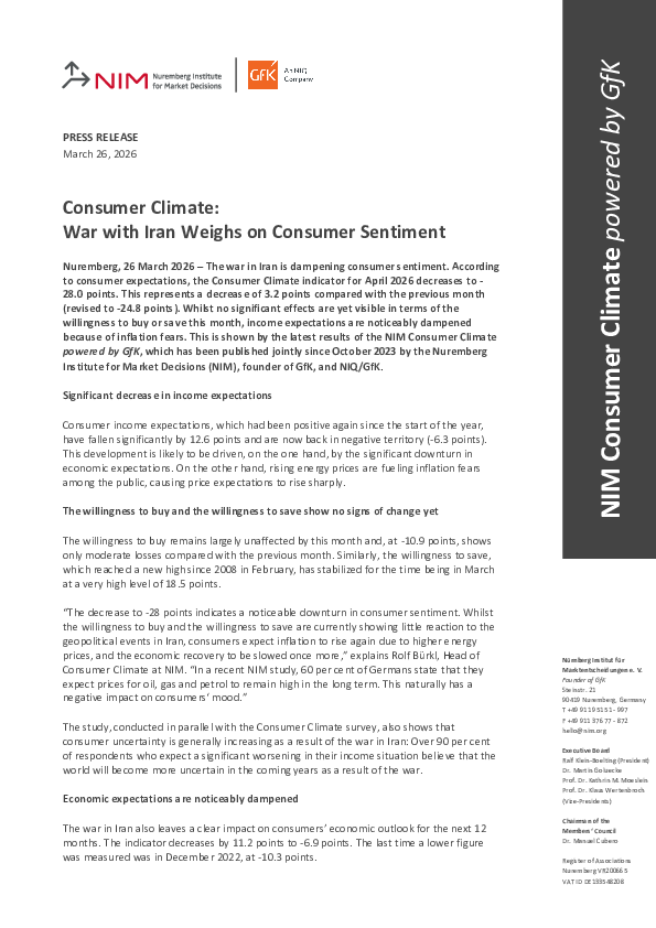 Nuremberg, 26 March 2026 – The war in Iran is dampening consumer sentiment. According to consumer expectations, the Consumer Climate indicator for April 2026 decreases to -28.0 points. This represents a decrease of 3.2 points compared with the previous month (revised to -24.8 points). Whilst no significant effects are yet visible in terms of the willingness to buy or save this month, income expectations are noticeably dampened because of inflation fears. This is shown by the latest results of the NIM Consumer Climate powered by GfK, which has been published jointly since October 2023 by the Nuremberg Institute for Market Decisions (NIM), founder of GfK, and NIQ/GfK.