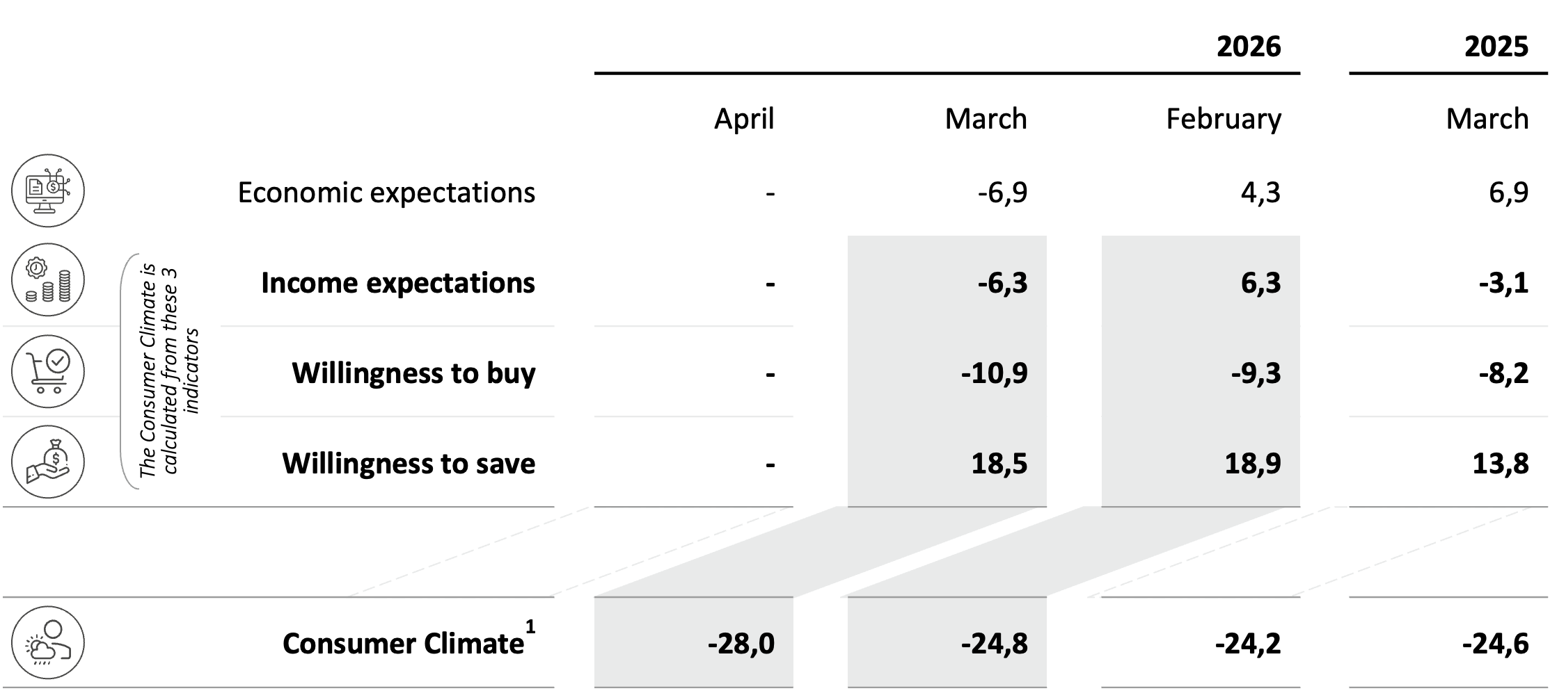 1Consumer Climate can be interpreted as a leading indicator of consumer behavior in Germany. Analyses have shown that sentiment is an early indicator for the actual development of private consumption. The Consumer Climate is calculated from the March values for income expectations, willingness to buy and willingness to save - as a leading indicator for the development of consumption in Apri 2026.