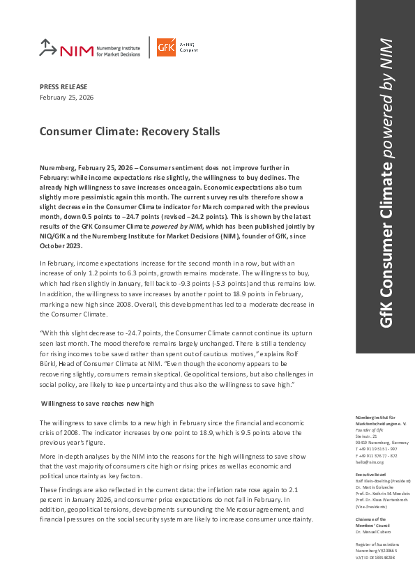 Nuremberg, February 25, 2026 – Consumer sentiment does not improve further in February: while income expectations rise slightly, the willingness to buy declines. The already high willingness to save increases once again. Economic expectations also turn slightly more pessimistic again this month. The current survey results therefore show a slight decrease in the Consumer Climate indicator for March compared with the previous month, down 0.5 points to −24.7 points (revised −24.2 points). This is shown by the latest results of the GfK Consumer Climate powered by NIM, which has been published jointly by NIQ/GfK and the Nuremberg Institute for Market Decisions (NIM), founder of GfK, since October 2023.