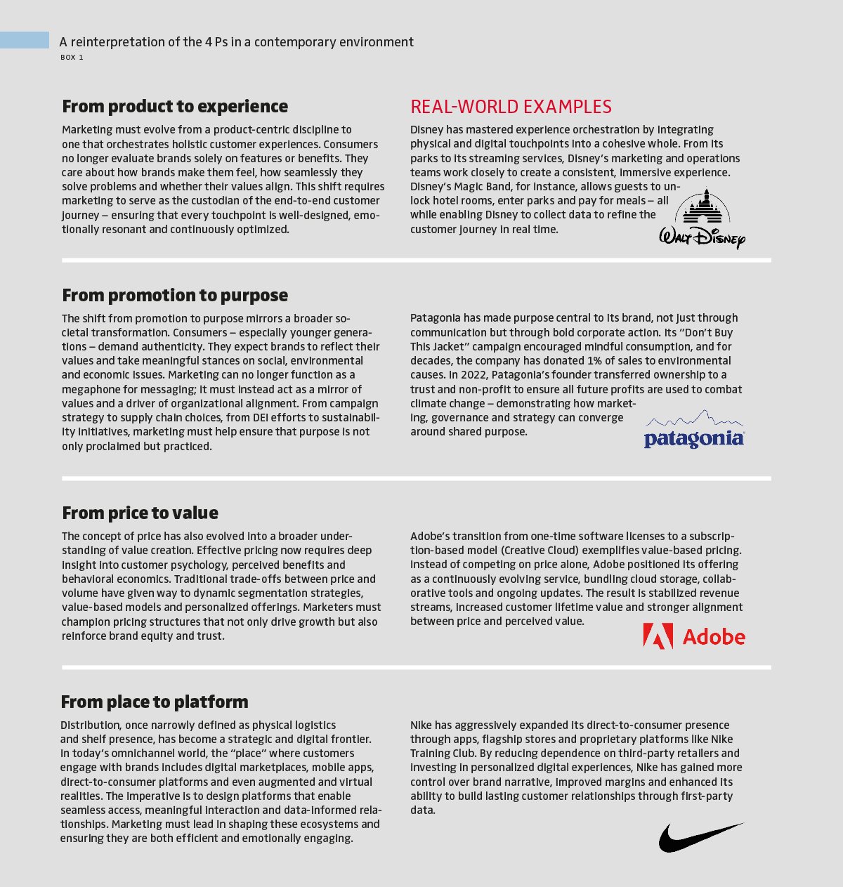 The original 4 Ps offered a useful framework – but one designed for a more stable and product-focused marketplace. Today’s environment is more volatile, interconnected and stakeholder-driven. Marketing must broaden its mandate – not by discarding the 4 Ps but by reimagining them for a world defined by experience, authenticity, value and access. In recent years, many marketers have begun to reinterpret the 4 Ps to better reflect contemporary challenges and opportunities (see Box 1). This reframing captures a deeper truth: marketing is no longer confined to its traditional boundaries. Instead, it has the potential to touch every facet of how value is created and delivered, within and beyond organizations.