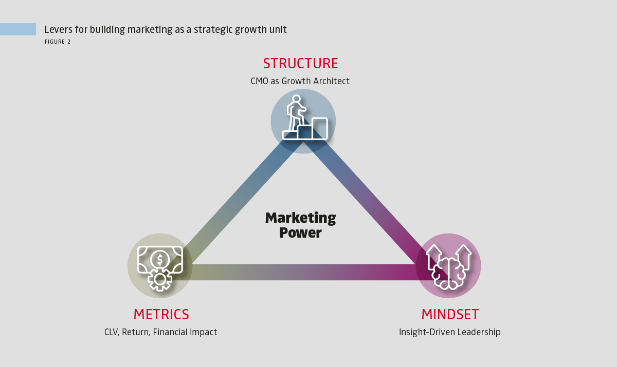 Marketing is moving beyond the 4 Ps – toward a function that shapes experiences, leads with purpose, delivers value and builds platforms. But how can marketing departments bring this vision to life? What must change within organizations to allow marketing to fulfill this expanded role? The answer, I believe, lies in large part in structure, metrics and mindset – three interdependent levers that determine whether marketing is treated as a tactical support unit or as a strategic growth engine. When approached intentionally, these levers can help reposition marketing as a central, value-creating force – one that earns its seat at the leadership table not by asking for it but by demonstrating its impact (Figure 2).