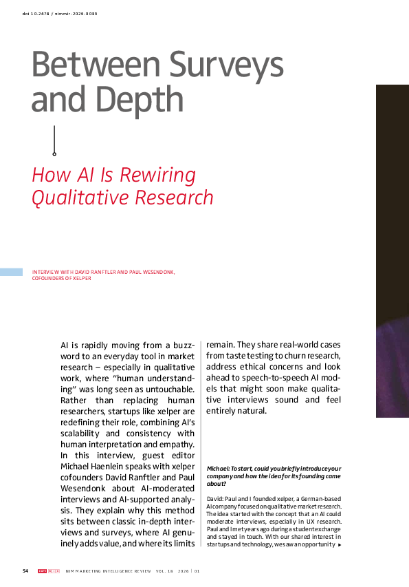 AI is rapidly moving from a buzzword to an everyday tool in market research – especially in qualitative work, where “human understanding” was long seen as untouchable. Rather than replacing human researchers, startups likexelper are redefining their role, combining AI’s scalability and consistency with human interpretation and empathy. In this interview, guest editor Michael Haenlein speaks with xelper cofounders David Ranftler and Paul Wesendonk about AI-moderated interviews and AI-supported analysis. They explain why this method sits between classic in-depth interviews and surveys, where AI genuinely adds value, and where its limits remain. They share real-world cases from taste testing to churn research, address ethical concerns and look ahead to speech-to-speech AI models that might soon make qualitative interviews sound and feel entirely natural.