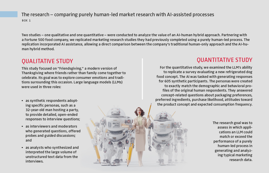 In our research, we analyze how AI-human hybrids can accelerate the marketing research process, reduce costs and uncover deeper insights (see Box 1). The results from two studies, where we replicate human-only market research projects, demonstrate that LLMs can serve as effective assistants at each stage of the research pipeline, from developing the research design to obtaining data, analyzing it and delivering insights that drive business decisions. We also test a novel application of LLMs – their ability to generate “synthetic respondents” – AI-powered personas that can participate in in-depth interviews or answer surveys.