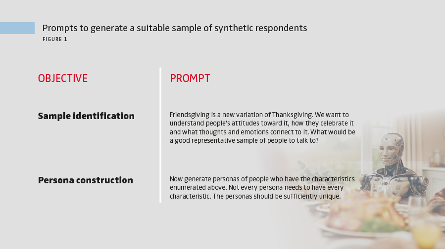 On the data generation front, we find that LLMs can effectively create the required characteristics for the sample to be interviewed. They succeeded in generating synthetic respondents that matched the characteristics of the original sample. Beyond replicating the respondent profiles in the original study, we asked the LLM to suggest a suitable group of respondents to generate ideas on the research topic of Friendsgiving, using the prompts in Figure 1. In response to the first prompt, the LLM produced a rich description of potential respondents. Although the original study had good variation in terms of respondent demographics such as gender, age and ethnicity, the LLM came up with additional dimensions, suggesting people with dietary restrictions or minorities such as LGBTQ+, expatriates and international students – all groups that may have particular interest in a more inclusive, modern Thanksgiving celebration. In response to the second prompt, the LLM generated 10 unique synthetic personas to match the suggestions, building an improved synthetic sample.