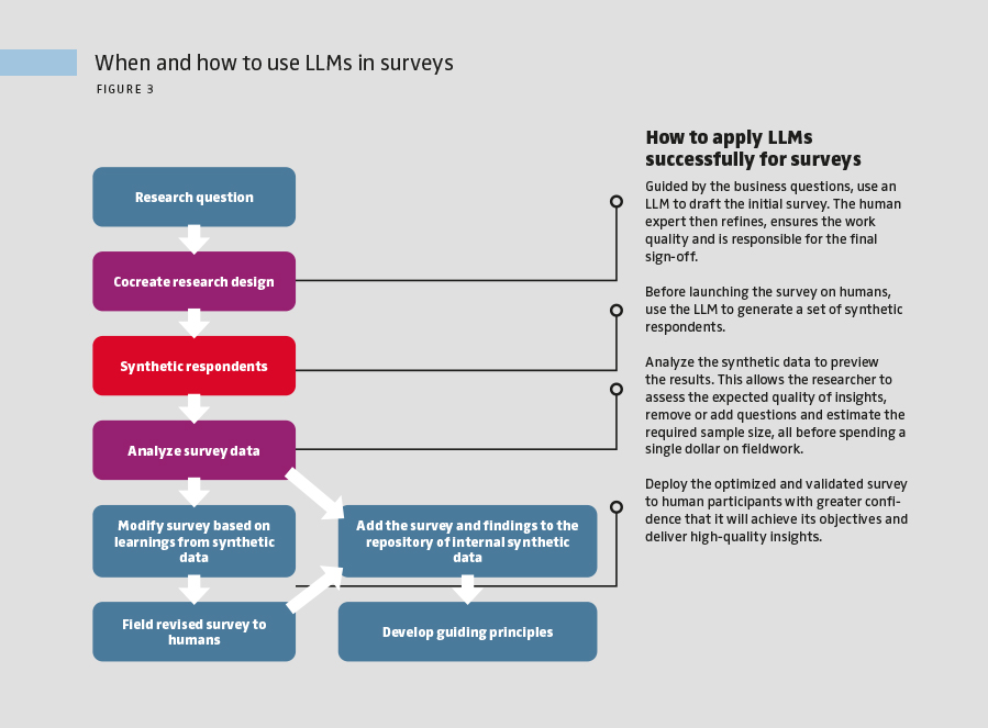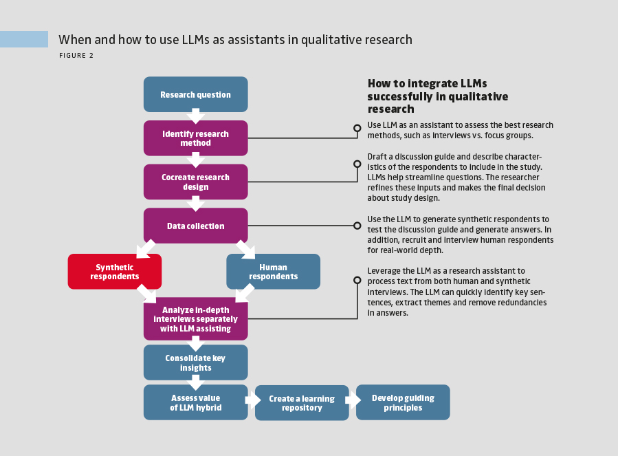 These LLM-assisted research processes improve the efficiency and speed of insight generation and the quality of analyses. With data analysis out of the way, researchers can focus their expert time on interpreting the findings and distilling insights. This approach synthesizes complementary insights from synthetic and human data to formulate recommendations that drive business decisions. The reimagined processes allow the researcher to focus on their study’s ability to answer business questions rather than accomplish repetitive tasks. Human experts can create internal learning repositories by saving both human and synthetic data. Comparing these datasets over time helps create institutional knowledge on business contexts when LLMs are most effective and develop guiding principles for future use.