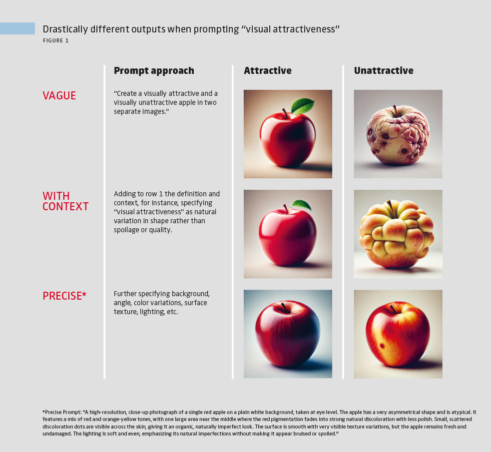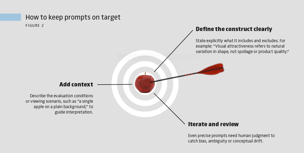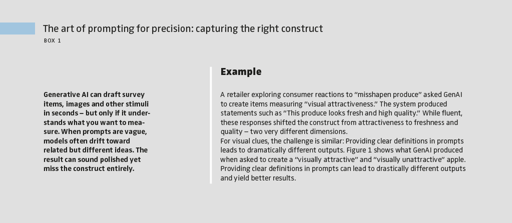 GenAI offers one of its greatest advantages in drafting survey items, scales and experimental stimuli. What once required time, creativity and often multiple iterations can now be generated in seconds. A single prompt can yield dozens of candidate items or ad copy variations, giving managers a breadth of options that would have been prohibitively costly to produce manually. The challenge is that these outputs are not always conceptually precise, as Figure 1 illustrates. One solution is to guide the model with clear definitions of what the focal construct includes and excludes (see Box 1). Even then, human review is critical to screen for any potential biases or ambiguities. For stimuli like ad copies or vignettes, the same principle applies: GenAI is a generator of alternatives, but managers must filter and refine those alternatives.