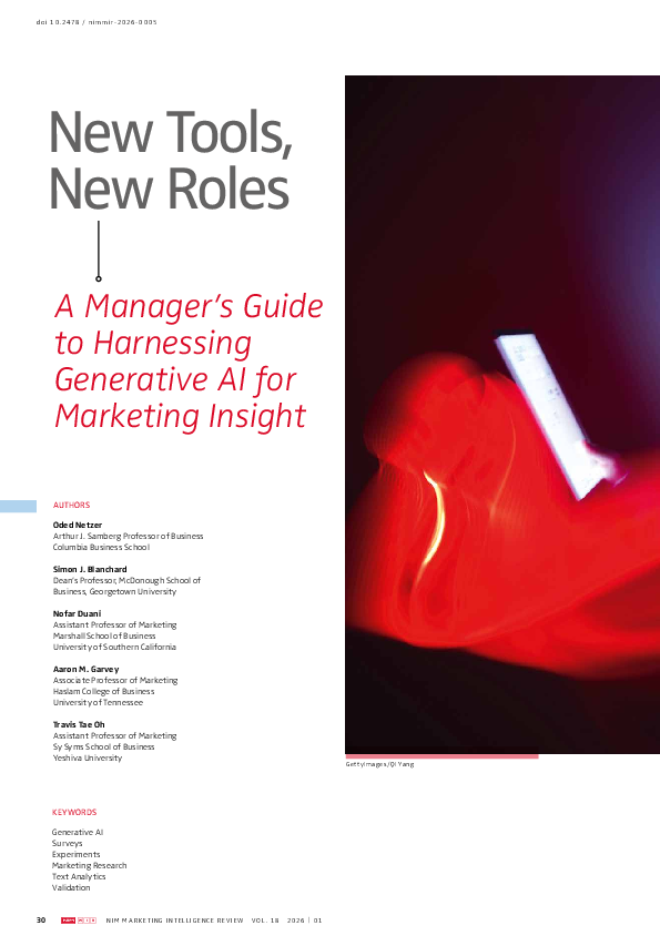 Netzer, O., Blanchard, S.J.., Duani, N., Garvey, A.M.. & Oh, T.T. (2026). New Tools, New Roles: A Manager’s Guide to Harnessing Generative AI for Marketing Insight. NIM Marketing Intelligence Review, 18(1), 30-35. https://doi.org/10.2478/nimmir-2026-0005