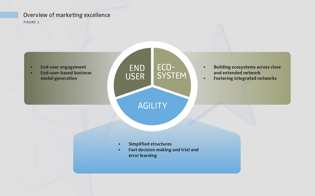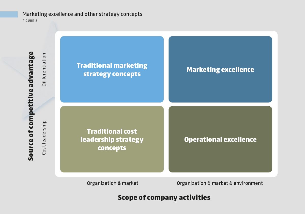 How can companies achieve organic growth? This question has always been at the heart of marketing. Over the years, various strategies have been proposed – from differentiation and market orientation to building marketing capabilities and now, marketing excellence. Although these concepts are related, they differ in their approach and scope. Marketing excellence builds on earlier marketing strategy concepts by emphasizing growth through new revenue streams and innovation rather than cost leadership. Unlike these earlier concepts, marketing excellence takes a much broader and more comprehensive approach. As Figure 2 shows, companies pursuing marketing excellence aim to shape not only the organization and the market but also the wider external environment — for example, by leveraging new, distal partnerships to develop additional revenue streams or by identifying untapped potential based on end-user needs. This comprehensive approach to both the immediate business landscape and the broader market environment enables companies to exploit novel growth opportunities.