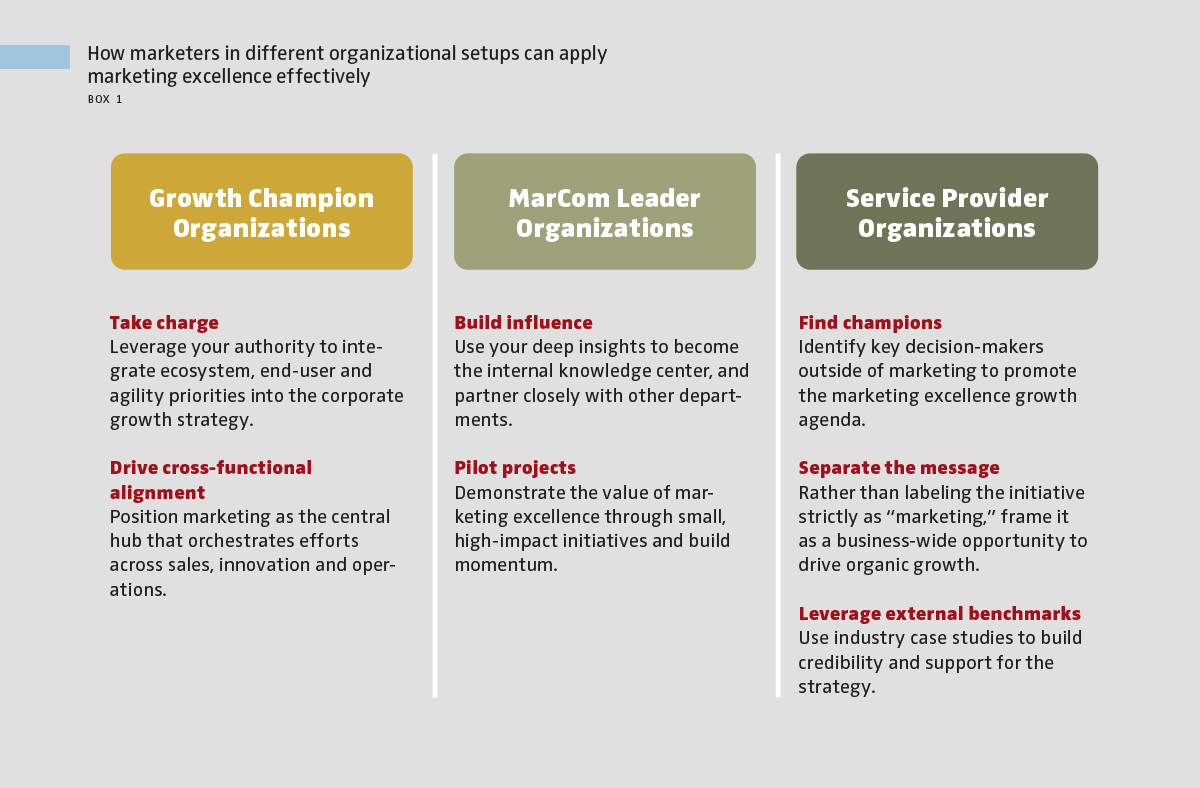 In Service Provider Organizations, marketing operates as a support function and is often seen as an executional team with no direct control over business strategy or growth decisions. In such organizational settings, marketers should identify key decision makers outside of marketing to promote the marketing excellence growth agenda and frame their projects as growth rather than marketing initiatives. Box 1 summarizes how marketing professionals can spur growth in these different types of marketing organizations.