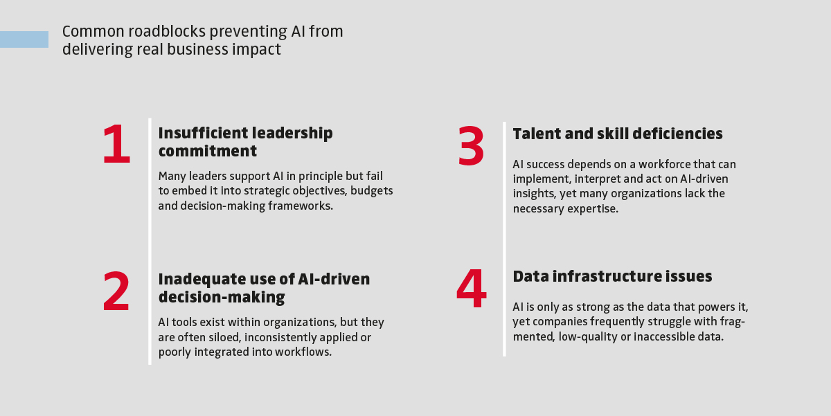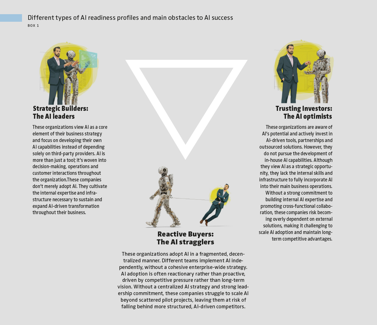 This disconnect is more than just a difference of opinion. It has real consequences. When organizations overestimate their AI readiness, they fail to recognize the foundational challenges slowing their progress. This misalignment results in an AI readiness gap – the shortfall between an organization’s current AI capabilities and the level of maturity required to fully integrate AI into its operations. The consequence? Many companies invest in AI but fail to embed it into the fabric of their operations. Some organizations approach AI the right way, while others take a reactive, piecemeal approach that limits its impact. Not surprisingly, most companies in the study fell short of best-practice benchmarks. Box 1 describes different organizational profiles of AI readiness and key barriers to AI adoption identified in our research.