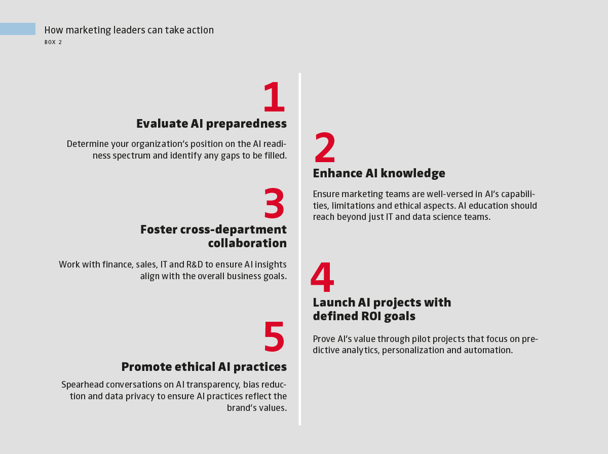 The time when the 4 Ps defined marketing strategies has ended. To regain and/or strengthen strategic influence, it's crucial for marketing to take the lead in adopting AI. AI now stands as the key strategic advantage, and marketers who adopt it will not only stay relevant but also broaden their impact within their organizations. Box 2 suggests steps that marketing leaders can take right now to strengthen their position in their organizations. By bridging the AI readiness gap, integrating AI-driven insights into their decision-making processes and spearheading the ethical use of AI, marketing leaders can regain a significant role in strategic discussions. The decision is straightforward: Marketers who skillfully utilize AI will influence the future of business, while those who do not will fall behind.