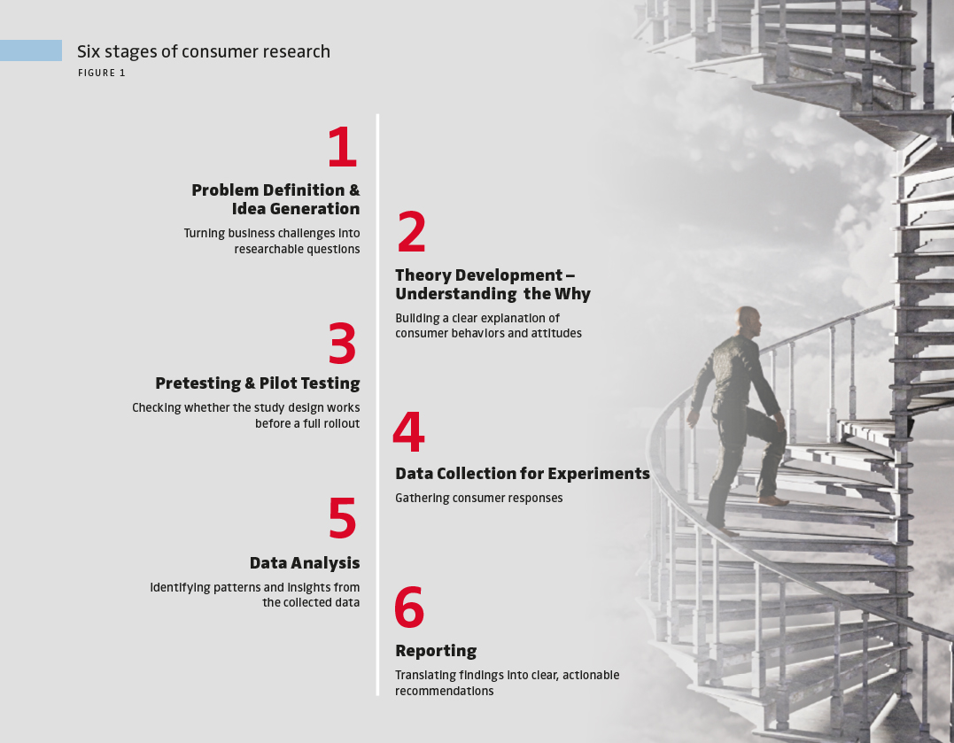 Consumer research follows a repeatable cycle from defining the problem to reporting results. Figure 1 describes the six common stages of the consumer research process. By walking through each stage, we can pinpoint what GenAI does well and where human judgment must lead. The goal of incorporating GenAI is not to replace researchers, but to free them for higher-value thinking while GenAI handles breadth, iteration and clarity.