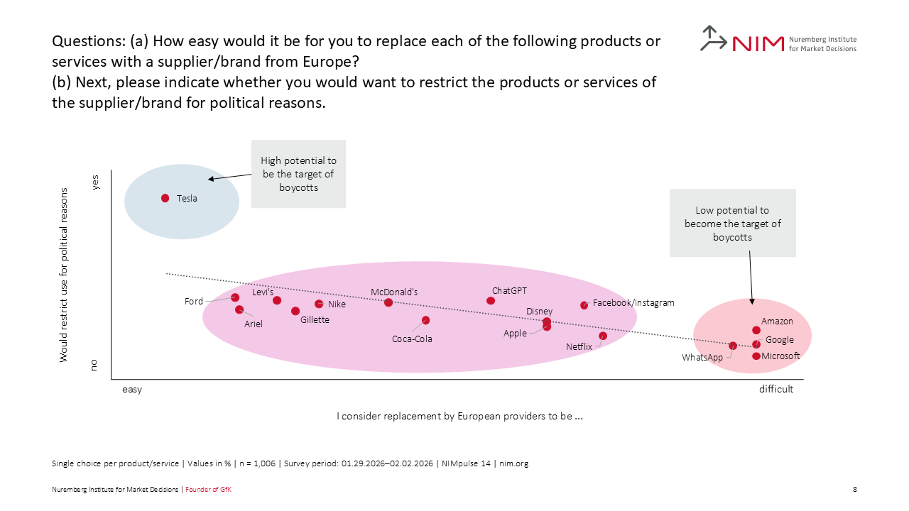 Large tech companies such as Google and Amazon are seen as difficult to replace, and only a few people say they want to use them less. Successful boycotts are unlikely here. Other U.S. brands are in the middle range in terms of replaceability, with very few people currently wanting to reduce their demand for them. Boycotts are currently unlikely here, but they are conceivable. The only brand that is currently considered easily replaceable and that many people say they would like to avoid in the future is Tesla.