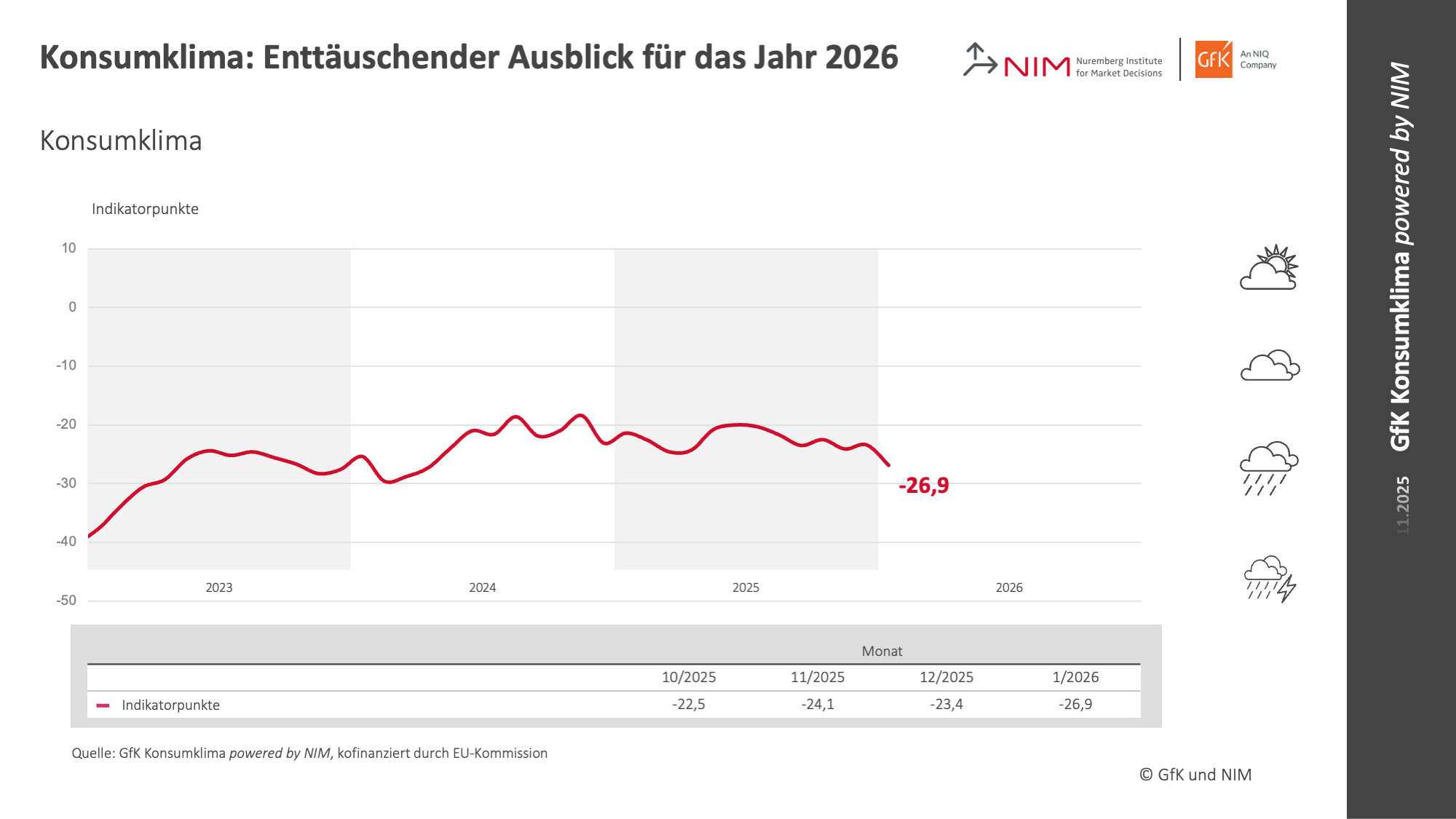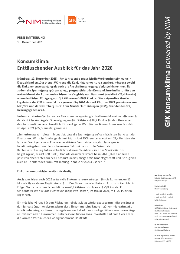 Nürnberg, 19. Dezember 2025 – Am Jahresende zeigt sich die Verbraucherstimmung in Deutschland enttäuschend: Während die Konjunkturerwartung stagniert, müssen sowohl die Einkommenserwartung als auch die Anschaffungsneigung Verluste hinnehmen. Da zudem die Sparneigung spürbar zulegt, prognostiziert der Konsumklima-Indikator für den ersten Monat des kommenden Jahres im Vergleich zum Vormonat (revidiert -23,4 Punkte) einen deutlichen Rückgang von 3,5 Zählern auf -26,9 Punkte. Dies zeigen die aktuellen Ergebnisse des GfK Konsumklimas powered by NIM, das seit Oktober 2023 gemeinsam von NIQ/GfK und dem Nürnberg Institut für Marktentscheidungen (NIM), Gründer der GfK, herausgegeben wird.