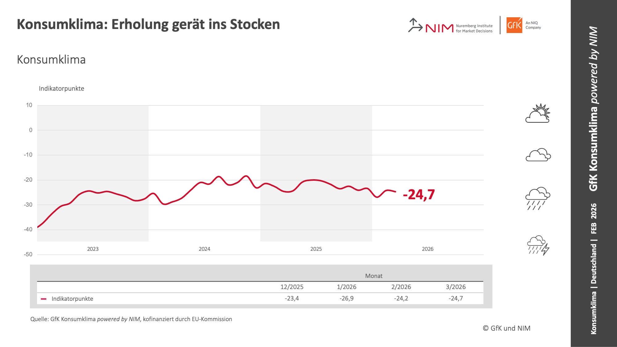 Nürnberg, 25. Februar 2026 – Im Februar hellt sich die Stimmung der Verbraucher nicht weiter auf: Während die Einkommenserwartungen noch leicht zunehmen, trübt sich die Anschaffungsneigung ein. Die ohnehin hohe Sparneigung legt nochmal zu. Und auch die Konjunkturerwartungen fallen diesen Monat wieder leicht pessimistischer aus. Die aktuellen Befragungsergebnisse zeigen daher für März im Vergleich zum Vormonat einen leichten Rückgang des Konsumklima-Indikators um 0,5 Punkte auf −24,7 Punkte (revidiert -24,2 Punkte). Dies zeigen die aktuellen Ergebnisse des GfK Konsumklimas powered by NIM, das seit Oktober 2023 gemeinsam von NIQ/GfK und dem Nürnberg Institut für Marktentscheidungen (NIM), Gründer der GfK, herausgegeben wird.