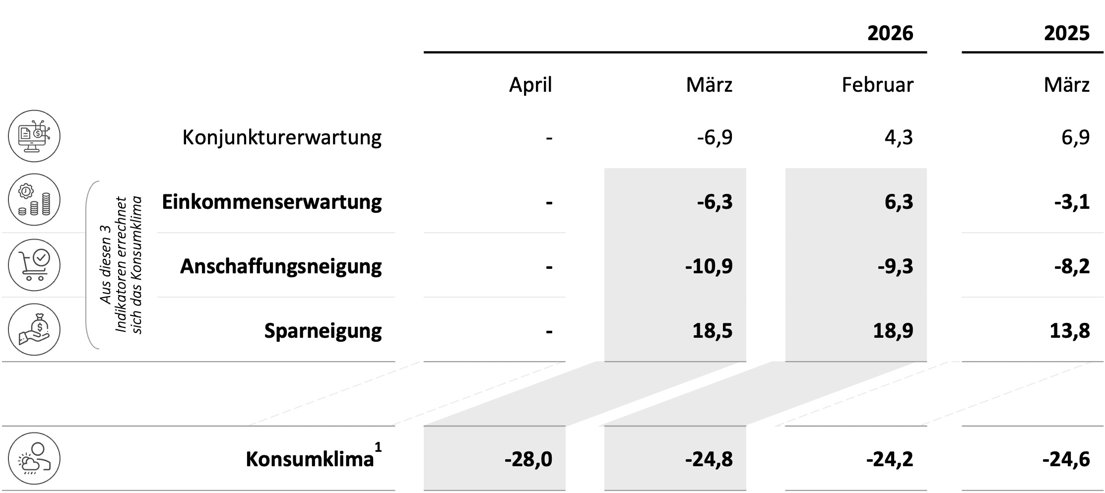 1Das Konsumklima kann als vorlaufender Indikator für das Konsumverhalten in Deutschland interpretiert werden. Analysen haben gezeigt, dass die Stimmung ein Frühindikator für die tatsächliche Entwicklung des privaten Konsums ist. Aus den im März 2026 ermittelten Werten der Einkommenserwartung, Anschaffungsneigung und Sparneigung errechnet sich das Konsumklima – als Frühindikator für die Entwicklung des Konsums im April 2026.