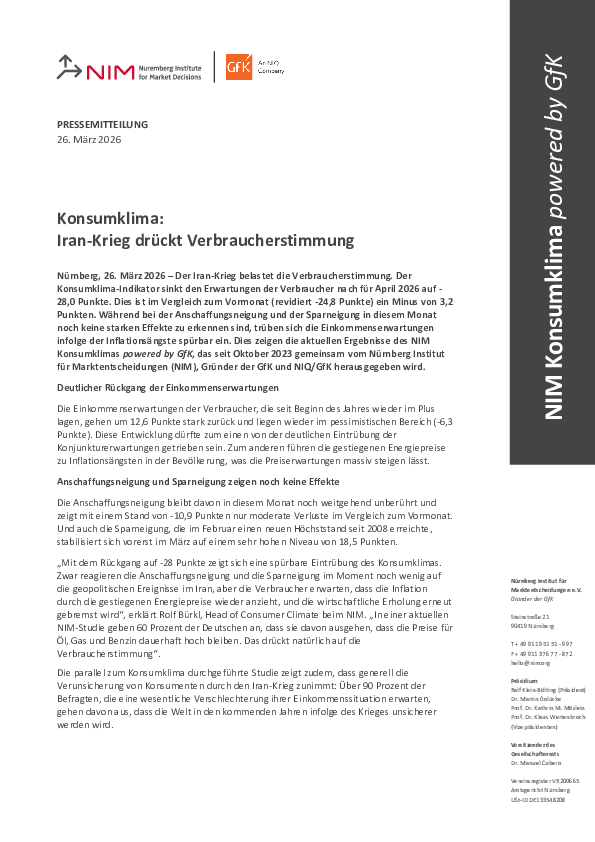 „Mit dem Rückgang auf -28 Punkte zeigt sich eine spürbare Eintrübung des Konsumklimas. Zwar reagieren die Anschaffungsneigung und die Sparneigung im Moment noch wenig auf die geopolitischen Ereignisse im Iran, aber die Verbraucher erwarten, dass die Inflation durch die gestiegenen Energiepreise wieder anzieht, und die wirtschaftliche Erholung erneut gebremst wird“, erklärt Rolf Bürkl, Head of Consumer Climate beim NIM. „In einer aktuellen NIM-Studie geben 60 Prozent der Deutschen an, dass sie davon ausgehen, dass die Preise für Öl, Gas und Benzin dauerhaft hoch bleiben. Das drückt natürlich auf die Verbraucherstimmung“.