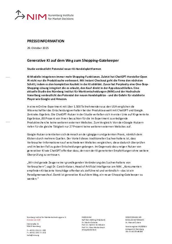 „Wir sind gerade Zeugen einer grundlegenden Veränderung des Suchverhaltens von Verbrauchern“, sagt Dr. Carolin Kaiser, Head of Artificial Intelligence am NIM. „Konsumenten empfinden KI-basierte Vorschläge offenbar als zielführend und verbindlich – das ist ein Paradigmenwechsel. Damit ist generative KI auf dem Weg, ein neuer Shopping-Gatekeeper zu werden.“