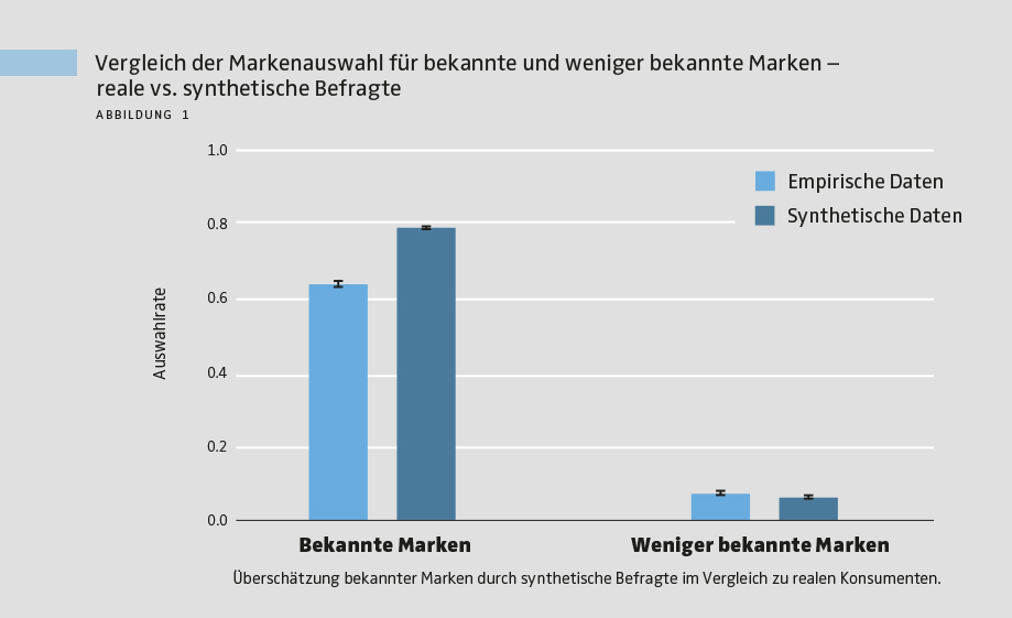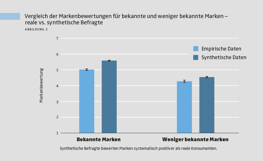 Wie erwartet wählten echte Teilnehmer im Marketing-Funnel deutlich häufiger bekannte als unbekannte Marken. Dieses Grundmuster wurde von den synthetischen Daten korrekt nachgebildet. Allerdings überschätzten die synthetischen Befragten die Auswahlwahrscheinlichkeit bekannter Marken deutlich (siehe Abbildung 1). Im Durchschnitt stimmten synthetische und reale Entscheidungen in 79 % der Fälle überein. Das zeigt: LLM-basierte Befragte erfassen die Richtung der Effekte, überschätzen aber systematisch, wie stark Konsumenten sich tatsächlich für eine Marke entscheiden. Ein ähnliches Bild ergab sich bei den Markenbewertungen. Echte Teilnehmer bewerteten bekannte Marken besser als weniger bekannte, und auch hier trafen die synthetischen Daten den Trend. Die absoluten Bewertungen fielen jedoch durchweg zu positiv aus – mit der stärksten Verzerrung zugunsten bekannter Marken. Über alle Marken hinweg wichen die synthetischen Bewertungen auf der 7-stufigen Skala im Schnitt um 1,2 Punkte von den realen Bewertungen ab.