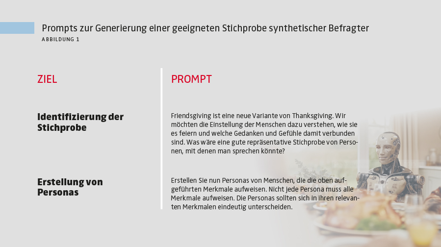 Im Bereich der Datengenerierung konnten LLMs die erforderlichen Merkmale für die zu befragende Stichprobe effektiv erstellen. Es gelang ihnen, synthetische Befragte zu generieren, die den Merkmalen der ursprünglichen Stichprobe entsprachen. Zusätzlich zur Nachbildung der Befragtenprofile der ursprünglichen Studie baten wir das LLM, mögliche zusätzlich relevante Gruppen von Befragten vorzuschlagen, die Ideen zum Forschungsthema „Friendsgiving“ beitragen könnten, wobei wir die in Abbildung 1 dargestellten Prompts verwendeten. Als Antwort auf den ersten Prompt erstellte das LLM eine ausführliche Beschreibung potenzieller Befragter. Obwohl die ursprüngliche Studie einen guten Mix aus demografischen Merkmalen der Befragten wie Geschlecht, Alter und ethnische Zugehörigkeit aufwies, entwickelte das LLM zusätzliche Dimensionen und schlug z.B. Personen mit Ernährungseinschränkungen, Minderheiten wie LGBTQ+, Auswanderer und internationale Studenten vor – alles Gruppen, die sehr plausibel ein besonderes Interesse an einer inklusiveren, moderneren Thanksgiving-Feier haben könnten. Als Antwort auf den zweiten Prompt generierte das LLM 10 synthetische Personas entsprechend den zuvor generierten Vorschlägen und verbesserte damit die synthetische Stichprobe.