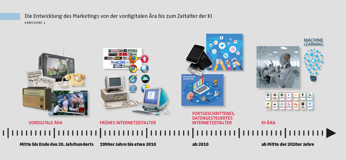 In der vordigitalen Ära, insbesondere in der zweiten Hälfte des 20. Jahrhunderts, bewegte sich Marketing in einem relativ stabilen Medienumfeld, das von Massenkommunikationskanälen wie Fernsehen, Print und Radio dominiert war. Marketingabteilungen konzentrierten sich häufig auf Werbung und Promotion, mit einem starken Fokus auf Markenbekanntheit, Positionierung und Massenkommunikation. Die 4 Ps spiegelten diese Rahmenbedingungen wider: Produkte waren oft standardisiert, Märkte weniger fragmentiert und Kundenfeedback-Schleifen langwierig und indirekt.