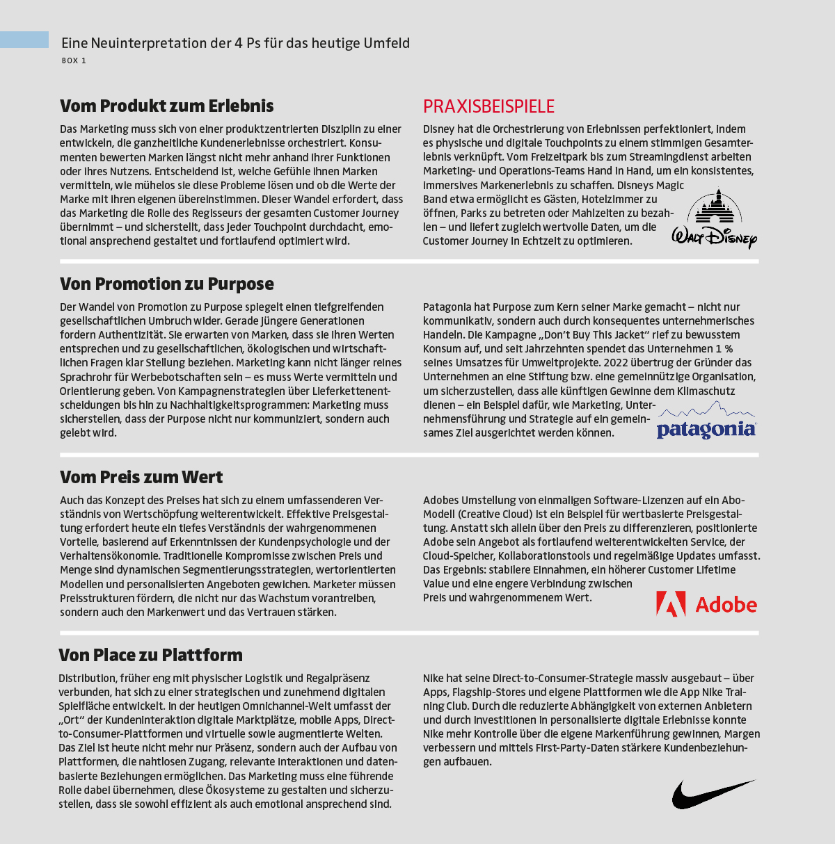 Die ursprünglichen 4 Ps boten einst einen hilfreichen Ansatz, waren jedoch für einen stabileren, produktzentrierten Markt konzipiert. Die heutige Realität ist volatiler, vernetzter und stärker von vielfältigen Stakeholdern geprägt. Das Marketing muss nun sein Mandat erweitern – nicht durch das Verwerfen der 4 Ps, sondern indem es sie neu interpretiert für eine Welt, in der Erlebnisse, Authentizität, Werte und Zugang entscheidend sind. In den letzten Jahren haben viele Marketer begonnen, die 4 Ps neu zu denken, um den aktuellen Herausforderungen und Chancen besser gerecht zu werden (siehe Box 1). Die Neukonzeption macht sichtbar, dass Marketing längst nicht mehr an seine klassischen Grenzen gebunden ist. Vielmehr hat es heute das Potenzial, alle Facetten der Wertschöpfung innerhalb und außerhalb von Unternehmen zu prägen.