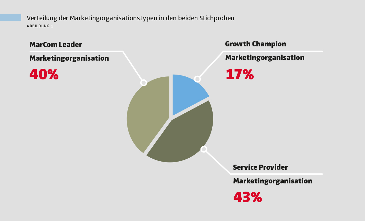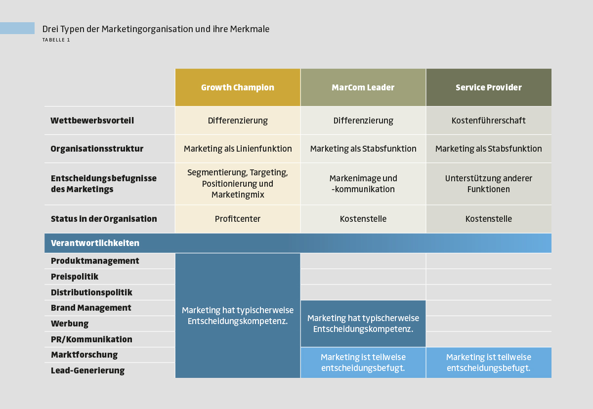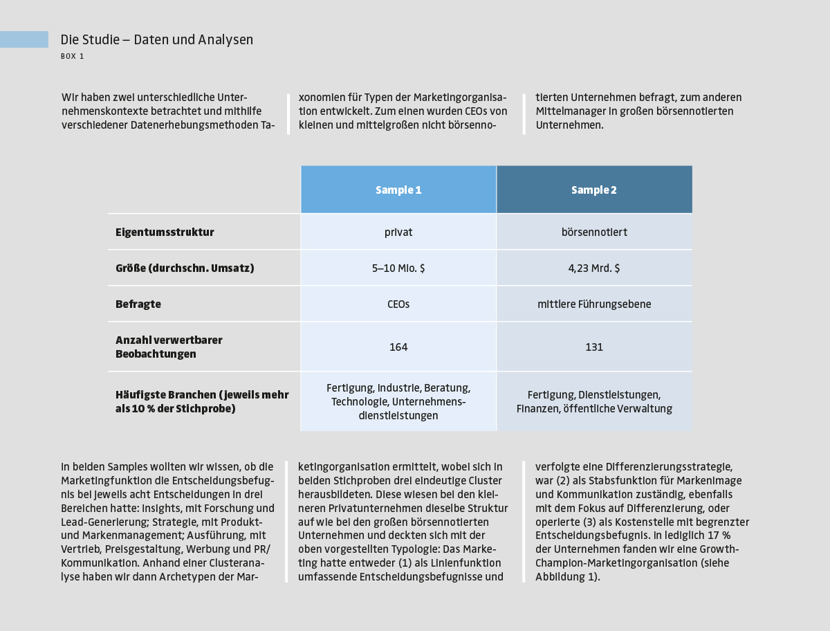 Wir haben vermutet, dass es in der Praxis vor allem drei Typen der Marketingorganisation gibt, die sich durch unterschiedliche Kombinationen der oben angeführten Wettbewerbsstrategien und Organisationsstrukturen beschreiben lassen. Eine empirische Studie, die zwei Analysen in unterschiedlichen Settings umfasste (siehe Box 1), bestätigte dies und wir konnten die folgenden drei Archetypen der Marketingorganisation identifizieren: Growth Champions, in denen das Marketing als Profitcenter federführend für das Unternehmenswachstum verantwortlich ist, MarCom Leaders, in denen das Marketing als Costcenter geführt wird und das Markenimage steuert, und Service Provider – hier agiert das Marketing als Dienstleister für andere Funktionen und wird ebenfalls als Costcenter geführt. Die ersten beiden Typen finden sich in Unternehmen, die ihren Wettbewerbsvorteil aus Differenzierung ziehen; der dritte Typ liegt in Unternehmen vor, deren Wettbewerbsvorteil in der Kostenführerschaft besteht. Beim ersten Typ ist das Marketing als Linienfunktion organisiert, beim zweiten und dritten Typ als Stabsfunktion (siehe Tabelle 1).