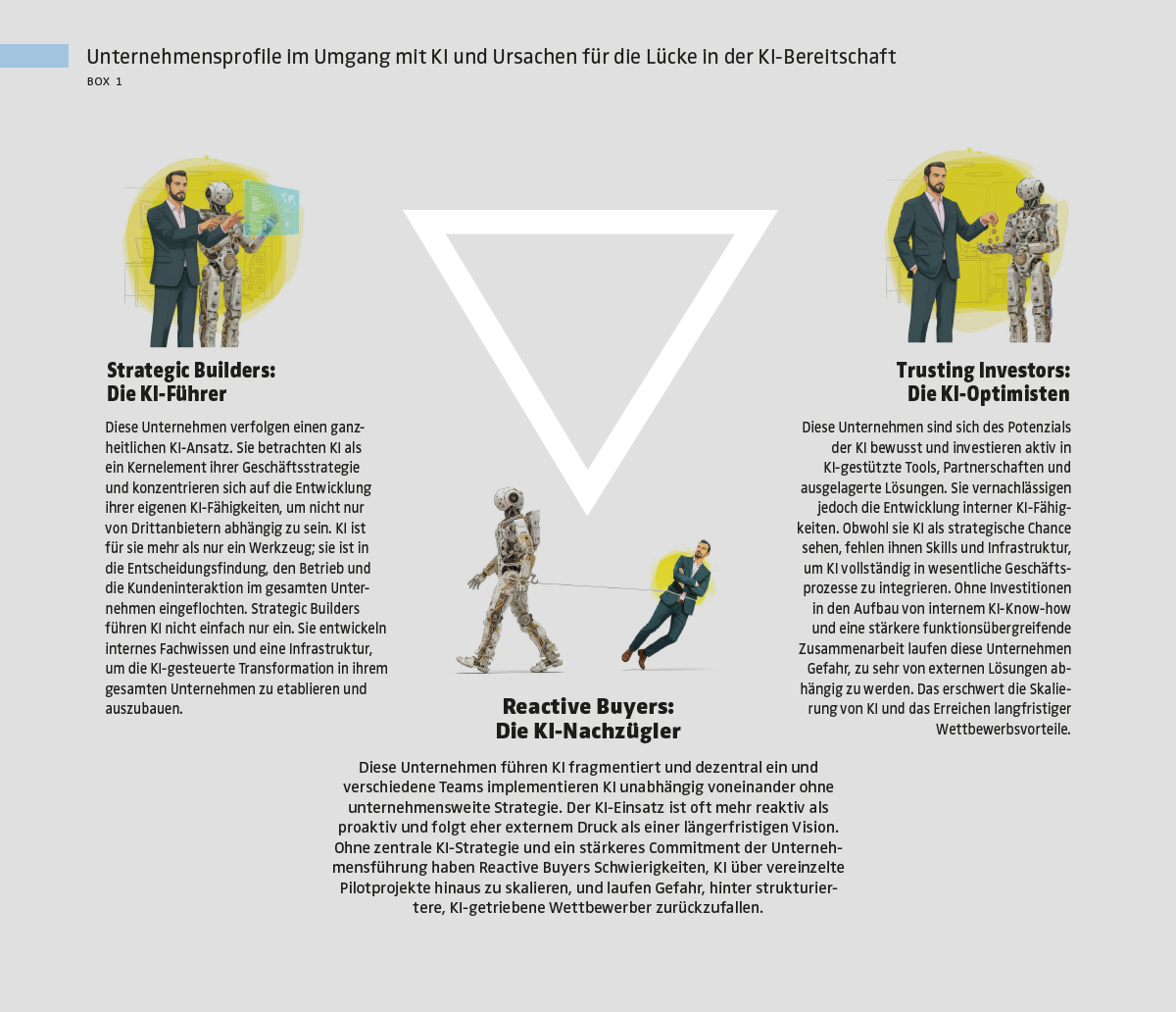 Die Folge? Zahlreiche Unternehmen investieren zwar in KI, schaffen es jedoch nicht, sie tiefgreifend in ihre operativen Abläufe zu integrieren. Während einige Organisationen einen strategisch durchdachten Ansatz verfolgen, agieren andere eher reaktiv und fragmentiert – was den möglichen Nutzen deutlich einschränkt. Wenig überraschend verfehlen die meisten Unternehmen etablierte Best-Practice-Benchmarks. Box 1 stellt unterschiedliche Organisationsprofile in Bezug auf ihre KI-Reife dar und beleuchtet zentrale Hürden einer erfolgreichen Implementierung, die wir in unserer Studie identifiziert haben.