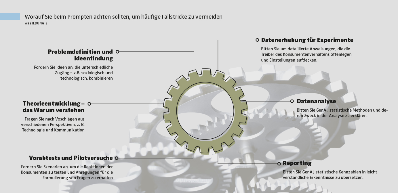 So wird aus „Wie können wir die Kundenbindung verbessern?“ schnell eine Reihe spezifischerer Hypothesen wie „Welche Produktfunktionen fördern Wiederholungskäufe?“ oder „Wie lässt sich Kommunikation auf Basis von Nutzungsmustern personalisieren?“ Doch Vorsicht: GenAI liefert Input, keine endgültigen Antworten. Menschliche Expertise ist entscheidend, um Ideen zu priorisieren, ihre Machbarkeit zu prüfen und die Markenrelevanz sicherzustellen. Teams, die GenAI zur Ideenexpansion nutzen und anschließend mit klarer Managementperspektive bewerten, starten mit schärfer definierten Problemen und einem präziseren Plan in die Forschung.
