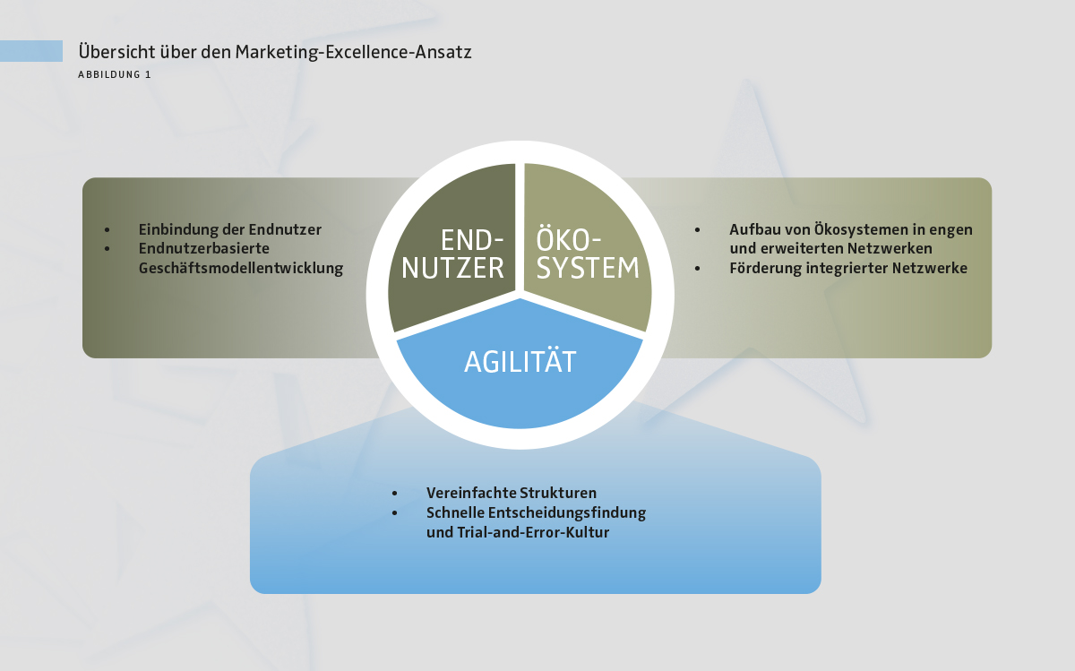 Tradierte Prinzipien wie „Der Kunde hat immer recht“ werden dem neuen Kontext nicht mehr gerecht. Aktuelle Forschung zeigt, dass die heutigen Growth Champions nicht mehr nur die Kunden in den Mittelpunkt stellen. Stattdessen bauen sie strategisch weit verzweigte, für alle Seiten vorteilhafte Netzwerke über Branchengrenzen hinweg auf und entwickeln Geschäftsmodelle, die sich an den Endnutzern statt nur an den unmittelbaren Kunden orientieren. Diesen breiteren, ganzheitlichen Ansatz für Wachstum bezeichnen wir als Marketing Excellence.