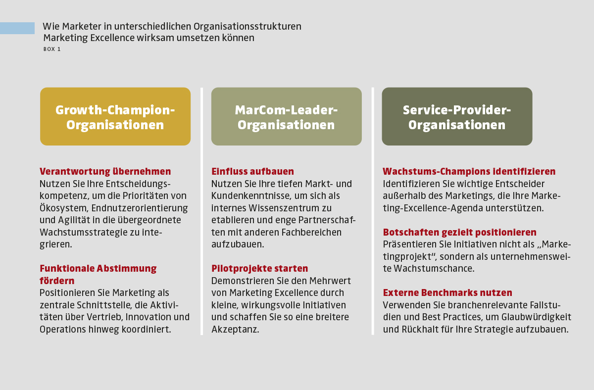 In Growth-Champion-Organisationen, in denen Marketing als zentrale Wachstumsfunktion gilt und über Entscheidungskompetenz in Schlüsselbereichen wie Preisgestaltung, Produktentwicklung und strategische Positionierung verfügt, besteht die Hauptaufgabe der Marketer darin, diese Autorität zu nutzen, um das gesamte Ökosystem zu integrieren und zu steuern – bei gleichzeitig hoher Agilität und funktionsübergreifender Abstimmung. In MarCom-Leader-Organisationen, in denen Marketing vorrangig für Markenführung und Kommunikation verantwortlich ist, aber nur begrenzten Einfluss auf wachstumsrelevante Themen wie Preisgestaltung, Vertrieb oder Distribution hat, ist die Rolle der Marketer anders gelagert. Hier gilt es, den Wert von Marketing Excellence in kleineren Pilotprojekten unter Beweis zu stellen und enge Partnerschaften mit anderen Fachbereichen aufzubauen. In Organisationen vom Typ Service-Provider hat das Marketing unterstützende und ausführende Funktion – ohne direkte Kontrolle über die Geschäfts- oder Wachstumsstrategie. Marketer sollten gezielt Schlüsselentscheider außerhalb der Marketingfunktion identifizieren. Ziel ist es, die Marketing-Excellence-Wachstumsagenda voranzutreiben und Projekte nicht als Marketing-, sondern als Wachstumsinitiativen zu positionieren. Box 1 fasst zusammen, wie Marketingexperten in den verschiedenen Organisationstypen gezielt Wachstum fördern können.