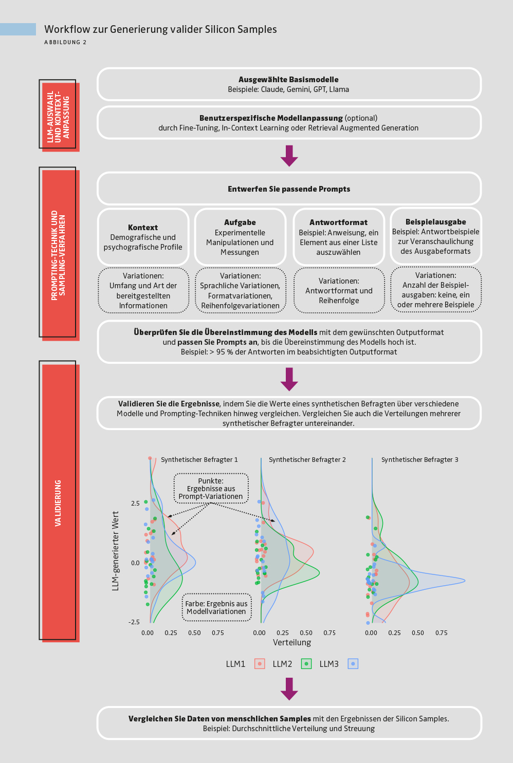 Angesichts der genannten Limitationen sollte der Output von LLMs nicht unreflektiert als Entscheidungsgrundlage herangezogen werden. Die Erzeugung valider Silicon Samples erfordert vielmehr eine sorgfältige Prüfung, einschließlich einer kritischen Bewertung des jeweiligen LLM-Outputs durch Forschende sowie eines systematischen Vergleiches mit von Menschen generierten Daten – sowohl auf Ebene einzelner synthetischer Befragter als auch für das gesamte Silicon Sample (siehe Abbildung 2).