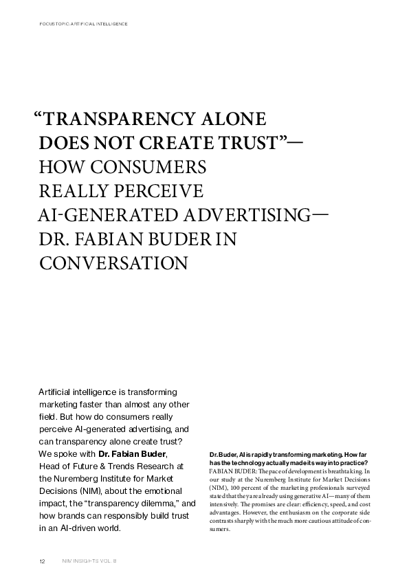 Transparency Alone Does Not Create Trust. How Consumers Really Perceive AI-Generated Advertising - Dr. Fabian Buder in Conversation (2025). NIM Insights Research Magazin Vol. 8 - AI.Meets.Consumer.