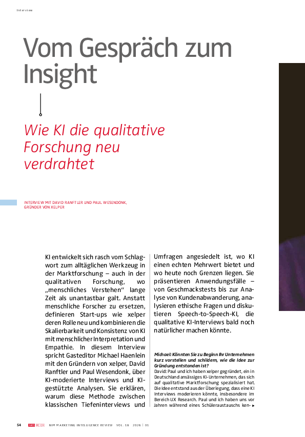 KI entwickelt sich rasch vom Schlagwort zum alltäglichen Werkzeug in der Marktforschung – auch in der qualitativen Forschung, wo „menschliches Verstehen“ lange Zeit als unantastbar galt. Anstatt menschliche Forscher zu ersetzen, definieren Start-ups wie xelperderen Rolle neu und kombinieren die Skalierbarkeit und Konsistenz von KI mit menschlicher Interpretation und Empathie. In diesem Interview spricht Gasteditor Michael Haenlein mit den Gründern von xelper, David Ranftler und Paul Wesendonk, über KI-moderierte Interviews und KI-gestützte Analysen. Sie erklären, warum diese Methode zwischen klassischen Tiefeninterviews und Umfragen angesiedelt ist, wo KI einen echten Mehrwert bietet und wo heute noch Grenzen liegen. Sie präsentieren Anwendungsfälle – von Geschmackstests bis zur Analyse von Kundenabwanderung, analysieren ethische Fragen und diskutieren Speech-to-Speech-KI, die qualitative KI-Interviews bald noch natürlicher machen könnte.