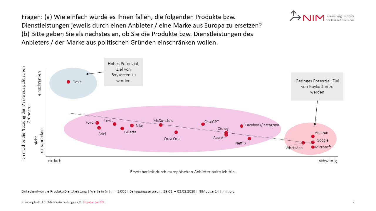 Große Techunternehmen wie Google und Amazon werden als schwierig zu ersetzen beurteilt, und nur wenige Personen geben an, diese weniger nutzen zu wollen. Erfolgreiche Boykotte sind hier unwahrscheinlich. Andere US-Marken bewegen sich in puncto Ersetzbarkeit in einem mittleren Bereich, wobei nur die Wenigsten ihre Nachfrage danach derzeit einschränken wollen. Boykotte sind hier derzeit unwahrscheinlich, aber denkbar. Die derzeit einzige Marke, die als einfach ersetzbar gilt und von der viele meinen, sie künftig meiden zu wollen, ist Tesla.