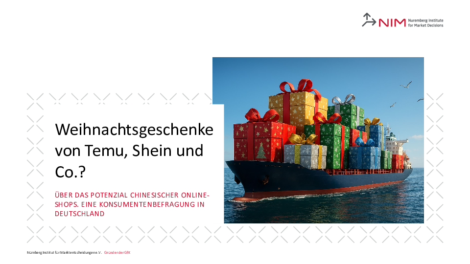 Das Nürnberg Institut für Marktentscheidungen (NIM) hat die aktuelle Nutzung und das zukünftige Potenzial chinesischer Online-Plattformen für den Kauf von Weihnachtsgeschenken in Deutschland im Rahmen einer repräsentativen Befragung ermittelt.